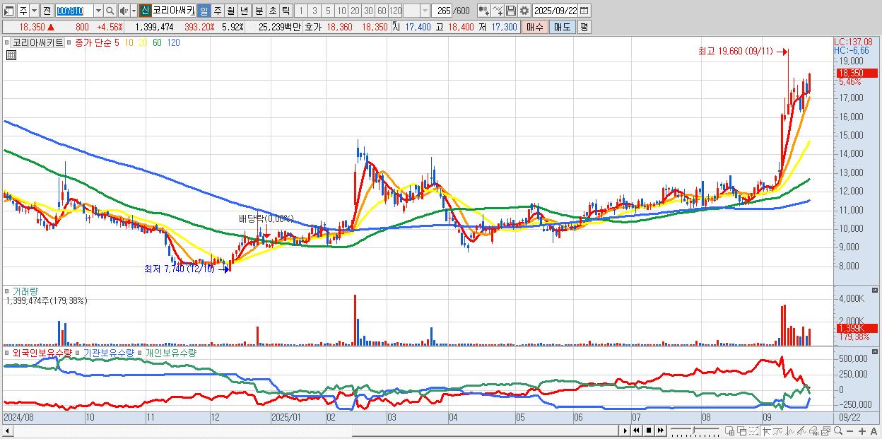 - 코리아써키트 (18,350원 ▲ 4.56% , 시총: 4,334억, 거래량: 1,399,474, 거래대금:252억, KOSPI)