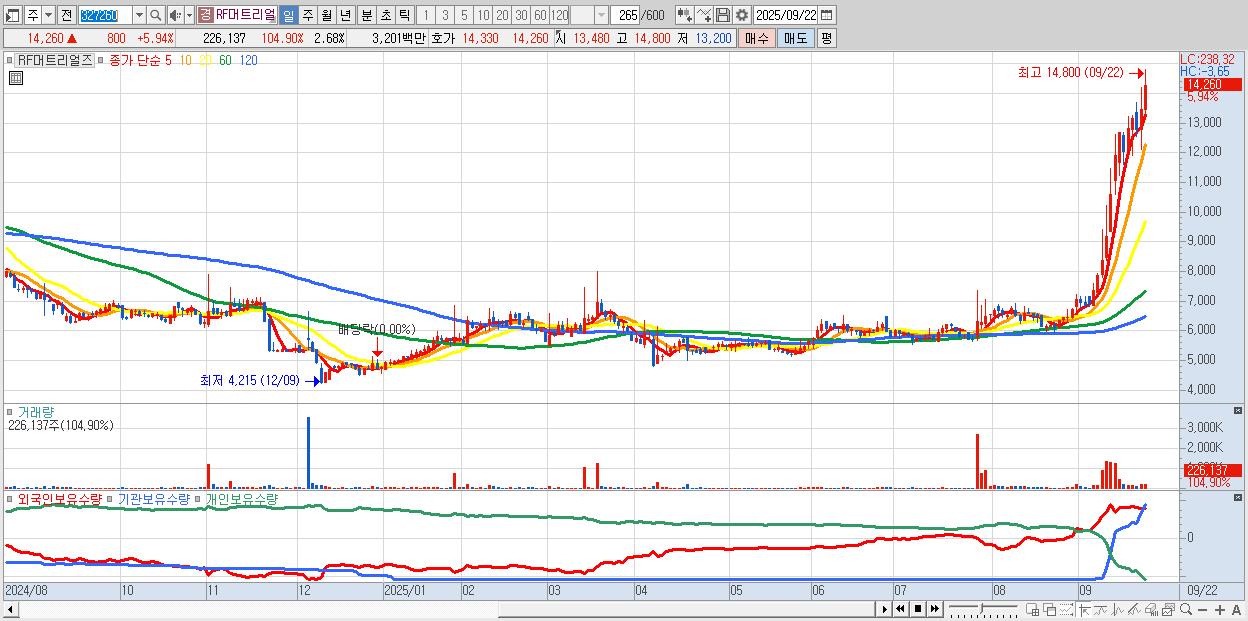 - RF머트리얼즈 (14,260원 ▲ 5.94% , 시총: 1,203억, 거래량: 226,137, 거래대금:32억, KOSDAQ)