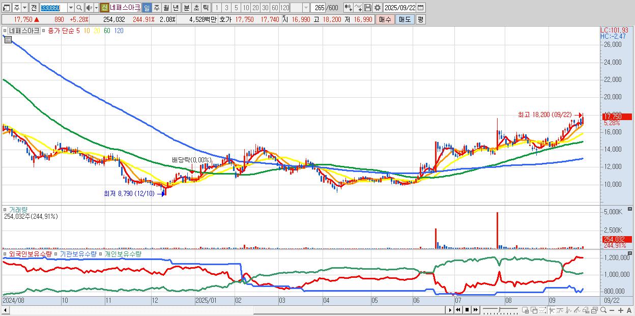 - 네패스아크 (17,750원 ▲ 5.28% , 시총: 2,163억, 거래량: 254,032, 거래대금:45억, KOSDAQ)