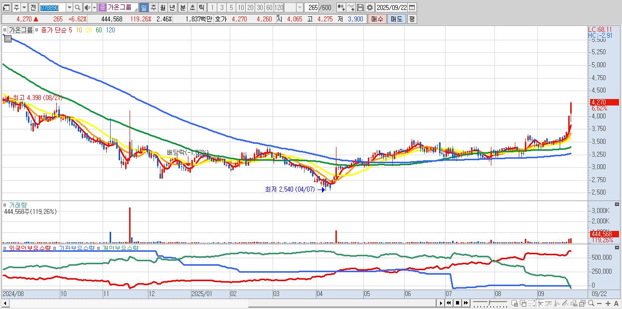 - 가온그룹 (4,270원 ▲ 6.62% , 시총: 771억, 거래량: 444,568, 거래대금:18억, KOSDAQ)