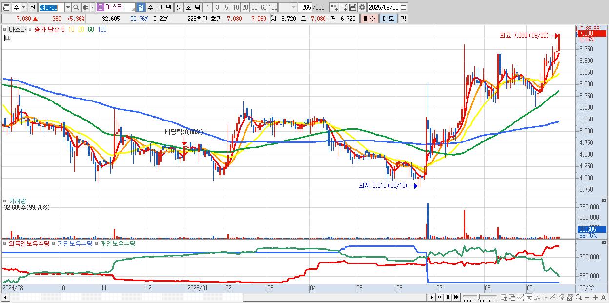 - 아스타 (7,080원 ▲ 5.36% , 시총: 1,030억, 거래량: 32,605, 거래대금:2억, KOSDAQ)