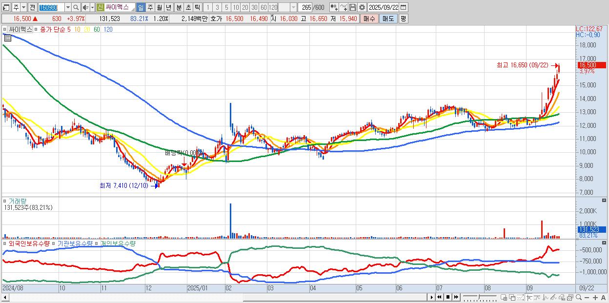 - 싸이맥스 (16,500원 ▲ 3.97% , 시총: 1,803억, 거래량: 131,523, 거래대금:21억, KOSDAQ)