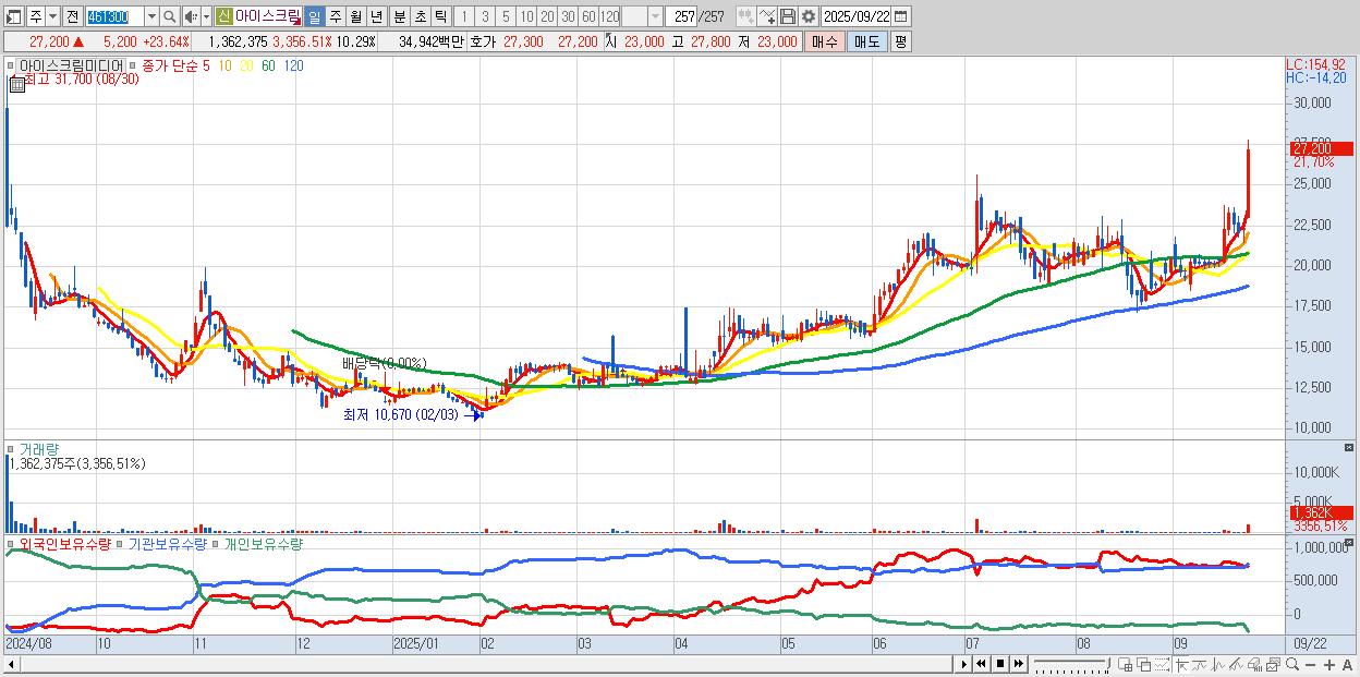 - 아이스크림미디어 (26,300원 ▲ 19.55% , 시총: 3,483억, 거래량: 575,104, 거래대금:148억, KOSDAQ)