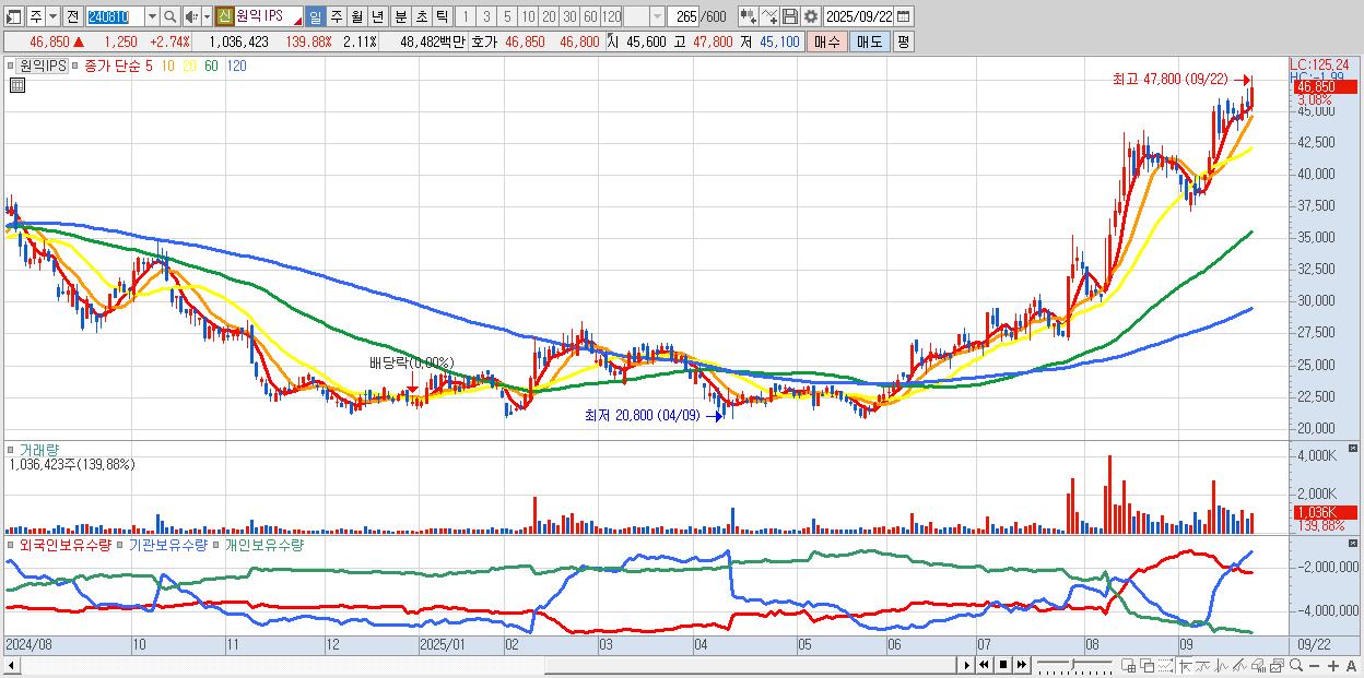 - 원익IPS (46,800원 ▲ 2.63% , 시총: 22,971억, 거래량: 706,723, 거래대금:331억, KOSDAQ)