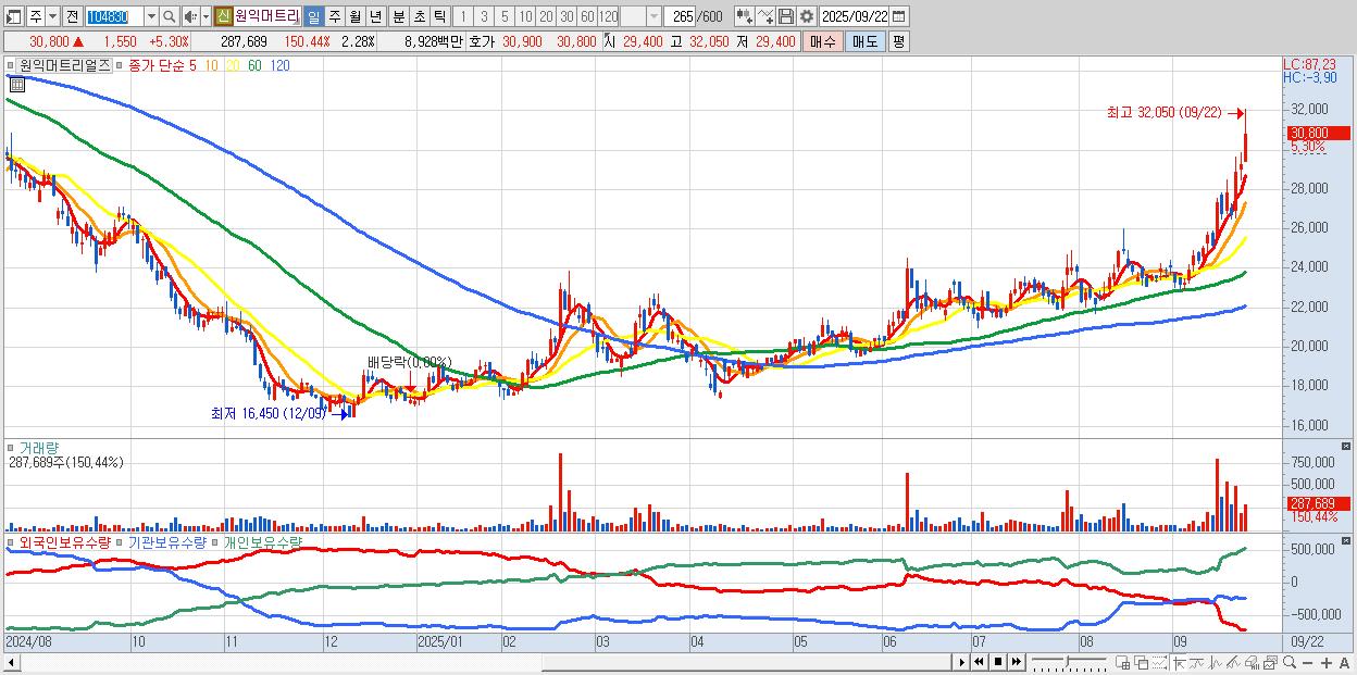 - 원익머트리얼즈 (30,800원 ▲ 5.3% , 시총: 3,883억, 거래량: 287,689, 거래대금:89억, KOSDAQ)