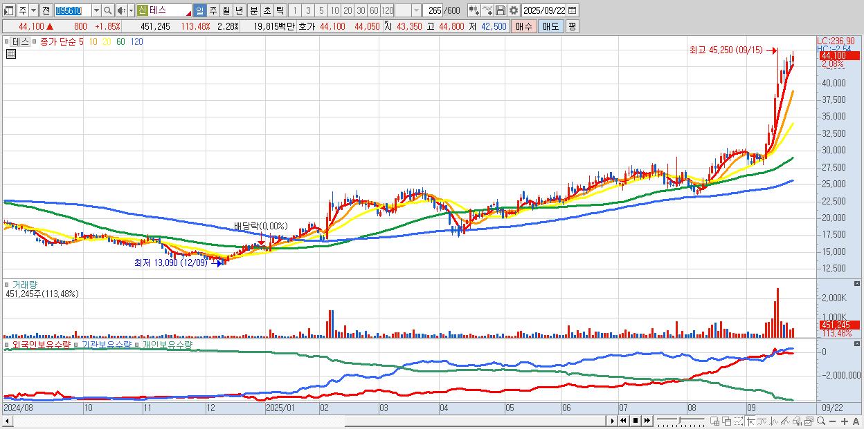 - 테스 (43,850원 ▲ 1.27% , 시총: 8,668억, 거래량: 275,949, 거래대금:121억, KOSDAQ)