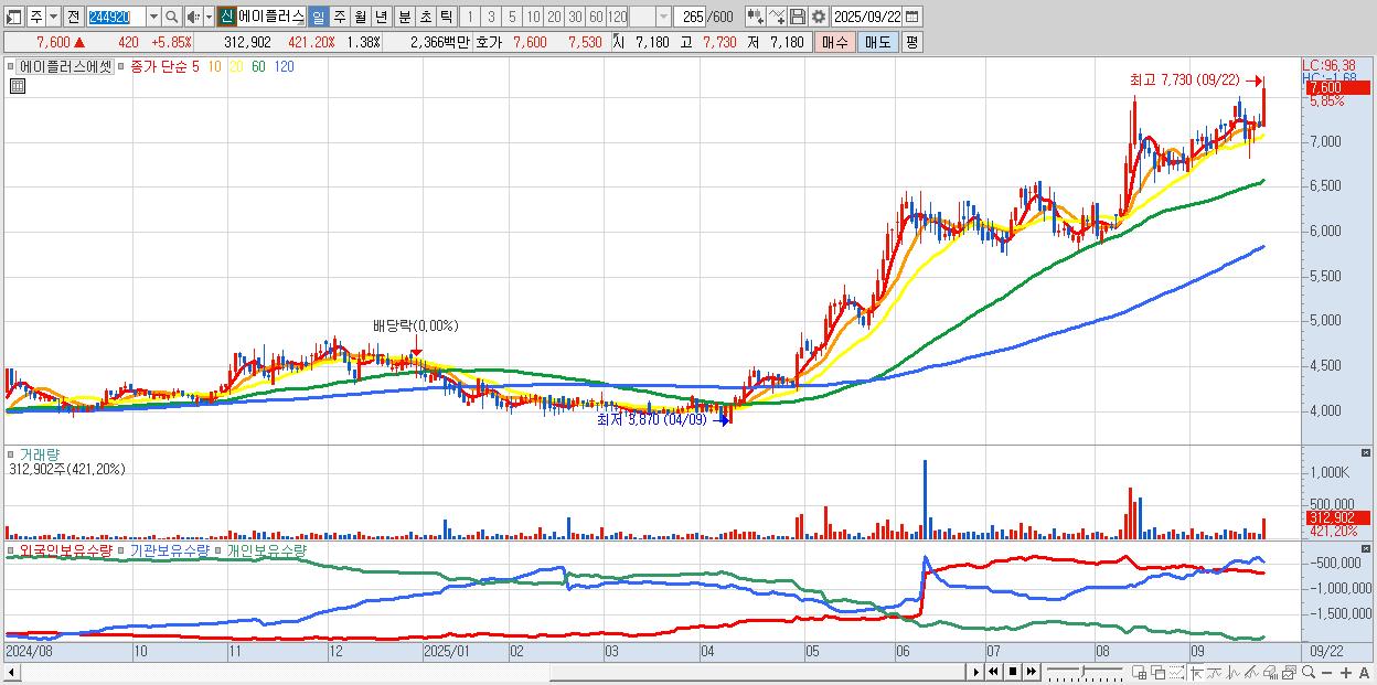 - 에이플러스에셋 (7,600원 ▲ 5.85% , 시총: 1,718억, 거래량: 312,902, 거래대금:24억, KOSPI)