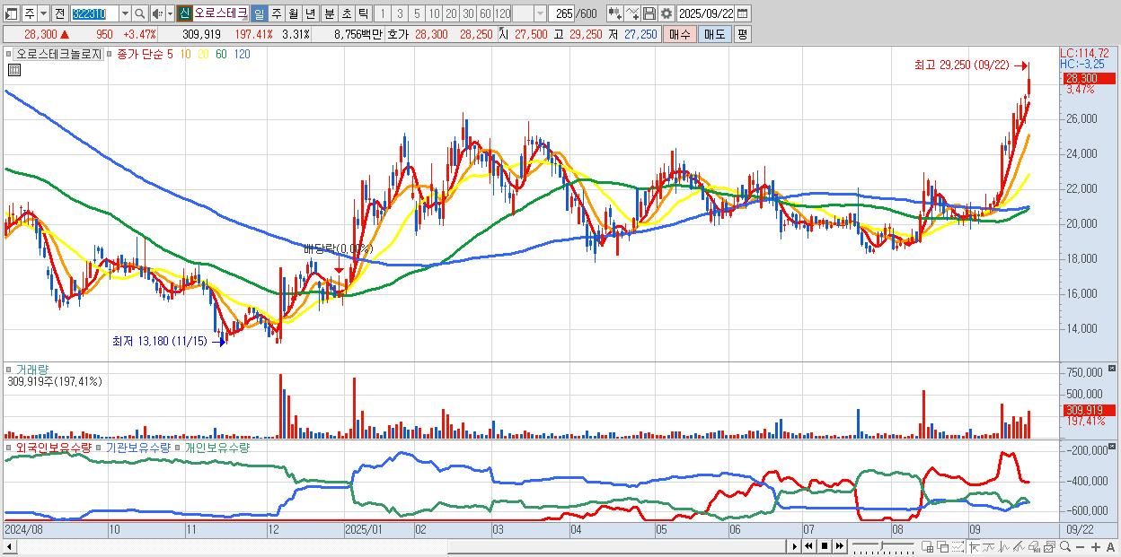 - 오로스테크놀로지 (28,300원 ▲ 3.47% , 시총: 2,651억, 거래량: 309,919, 거래대금:88억, KOSDAQ)