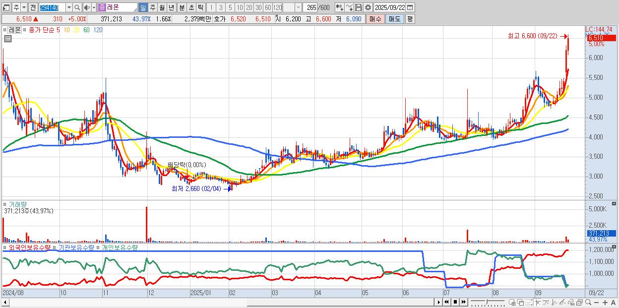 - 레몬 (6,510원 ▲ 5% , 시총: 1,459억, 거래량: 371,213, 거래대금:24억, KOSDAQ)