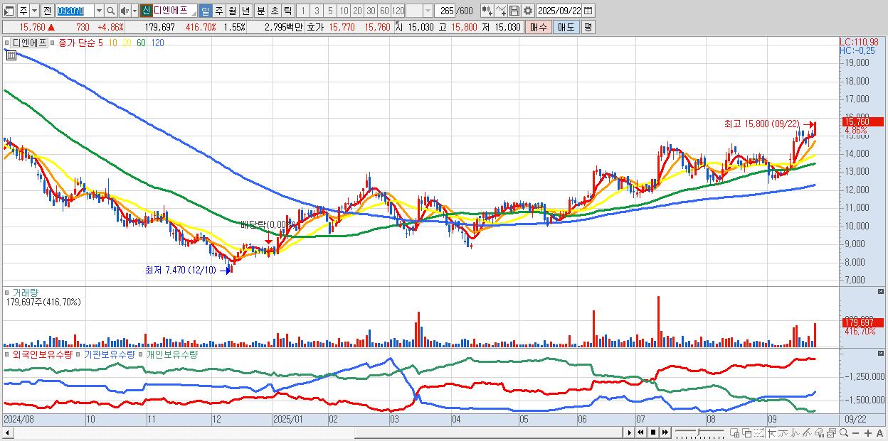 - 디엔에프 (15,760원 ▲ 4.86% , 시총: 1,824억, 거래량: 179,697, 거래대금:28억, KOSDAQ)