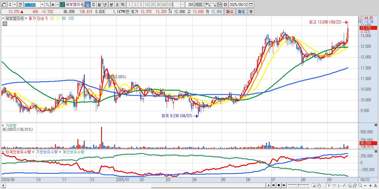 - 세보엠이씨 (13,370원 ▲ 3.72% , 시총: 1,408억, 거래량: 86,099, 거래대금:11억, KOSDAQ)