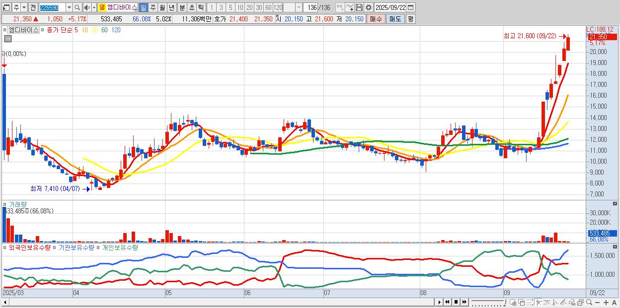 - 엠디바이스 (21,350원 ▲ 5.17% , 시총: 2,270억, 거래량: 533,485, 거래대금:113억, KOSDAQ)