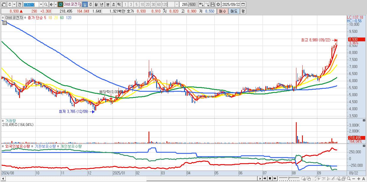 - 아비코전자 (8,930원 ▲ 3.36% , 시총: 1,187억, 거래량: 218,495, 거래대금:19억, KOSDAQ)