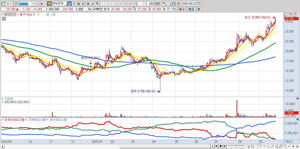 - 대덕전자 (28,300원 ▲ 4.24% , 시총: 13,985억, 거래량: 1,928,640, 거래대금:543억, KOSPI)