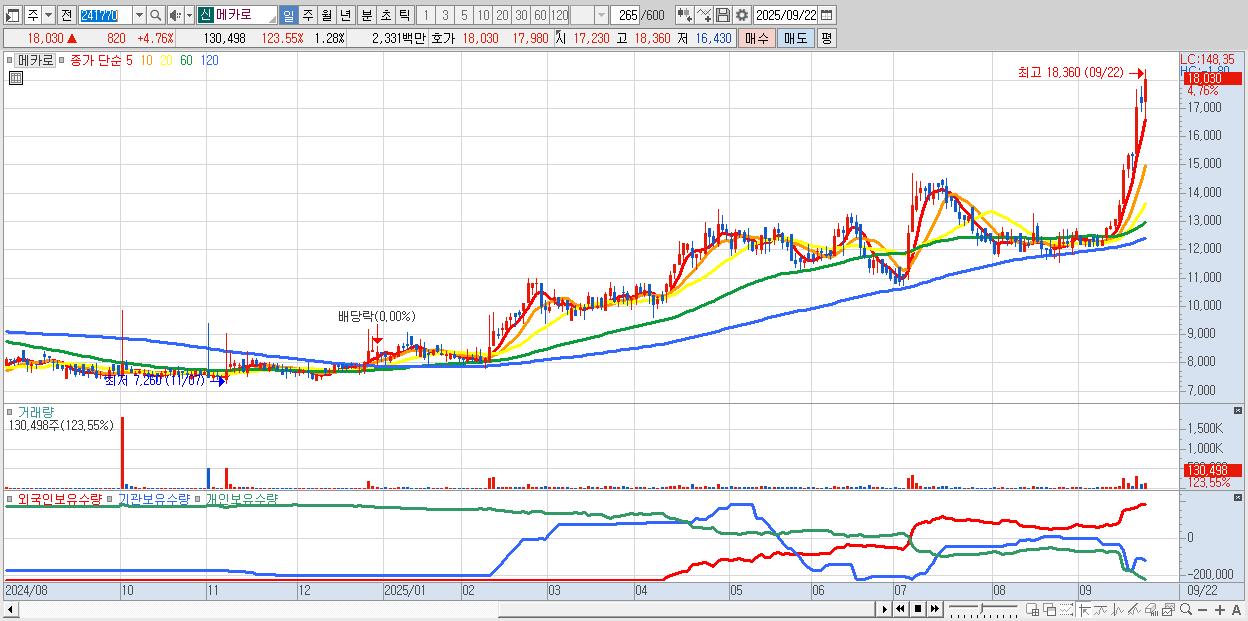 - 메카로 (18,030원 ▲ 4.76% , 시총: 1,838억, 거래량: 130,498, 거래대금:23억, KOSDAQ)