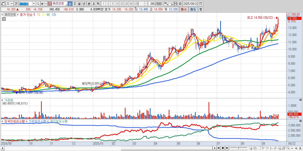 - 큐리언트 (14,320원 ▲ 6.15% , 시총: 4,985억, 거래량: 340,458, 거래대금:48억, KOSDAQ)