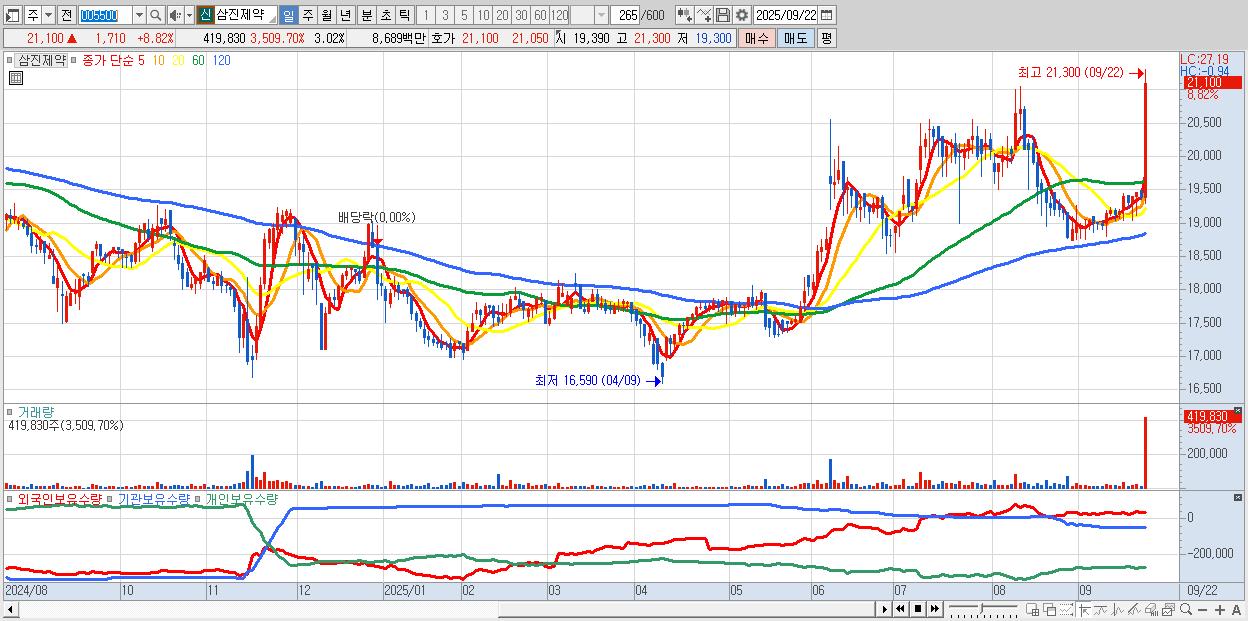 - 삼진제약 (21,100원 ▲ 8.82% , 시총: 2,933억, 거래량: 419,830, 거래대금:87억, KOSPI)