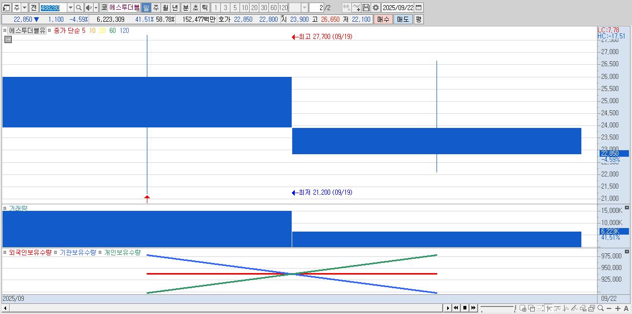 - 에스투더블유 (22,850원 ▼ -4.59% , 시총: 2,419억, 거래량: 6,223,309, 거래대금:1,525억)