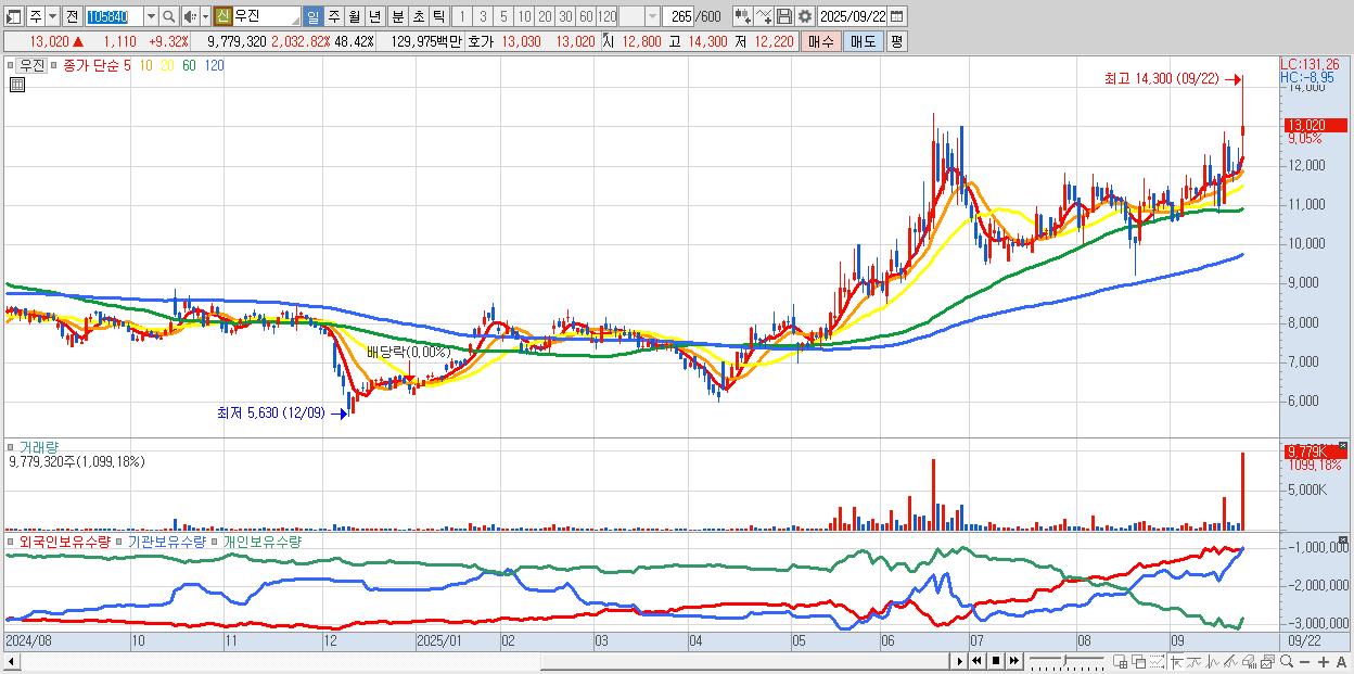 - 우진 (13,020원 ▲ 9.32% , 시총: 2,630억, 거래량: 9,779,320, 거래대금:1,300억)