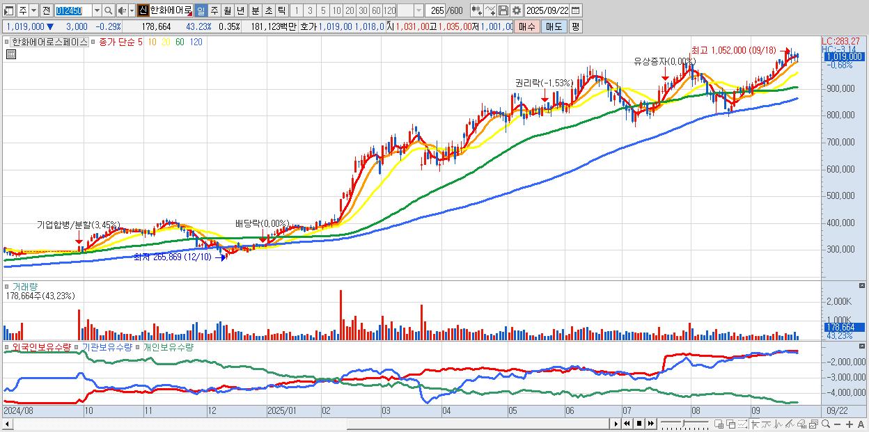 - 한화에어로스페이스 (1,022,000원 0% , 시총: 526,978억, 거래량: 137,450, 거래대금:1,393억)