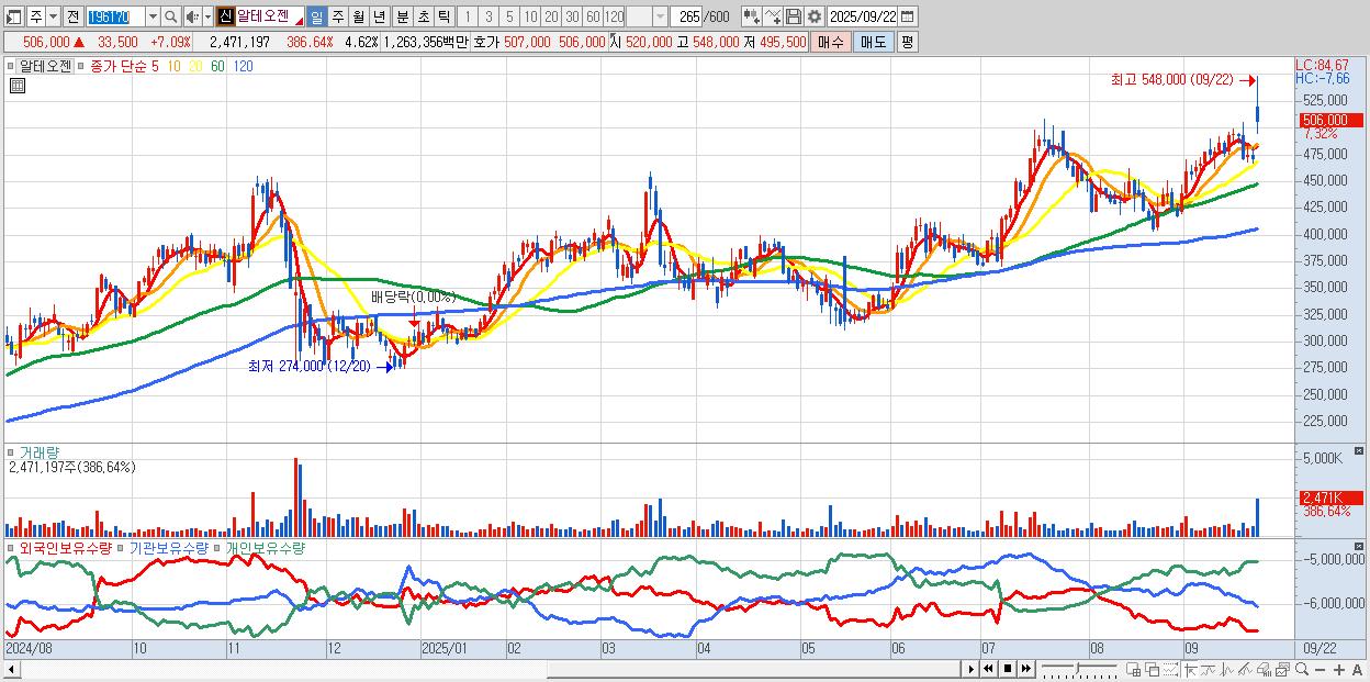 - 알테오젠 (507,000원 ▲ 7.3% , 시총: 271,067억, 거래량: 1,005,543, 거래대금:5,135억)