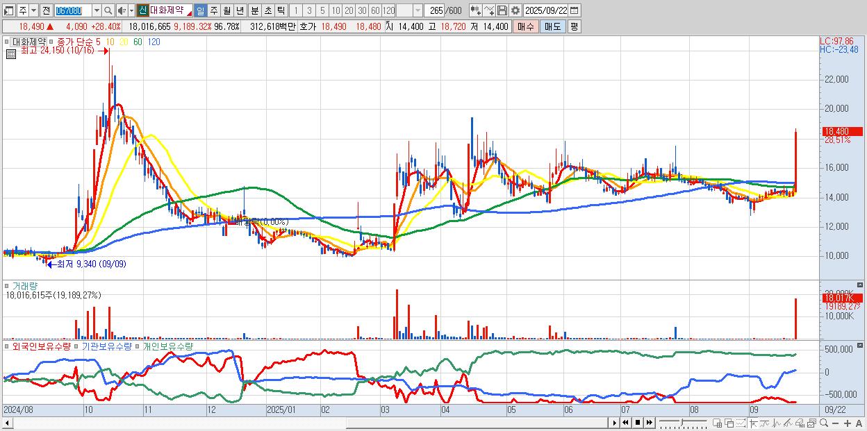 - 대화제약 (18,290원 ▲ 27.01% , 시총: 3,405억, 거래량: 9,102,351, 거래대금:1,574억)