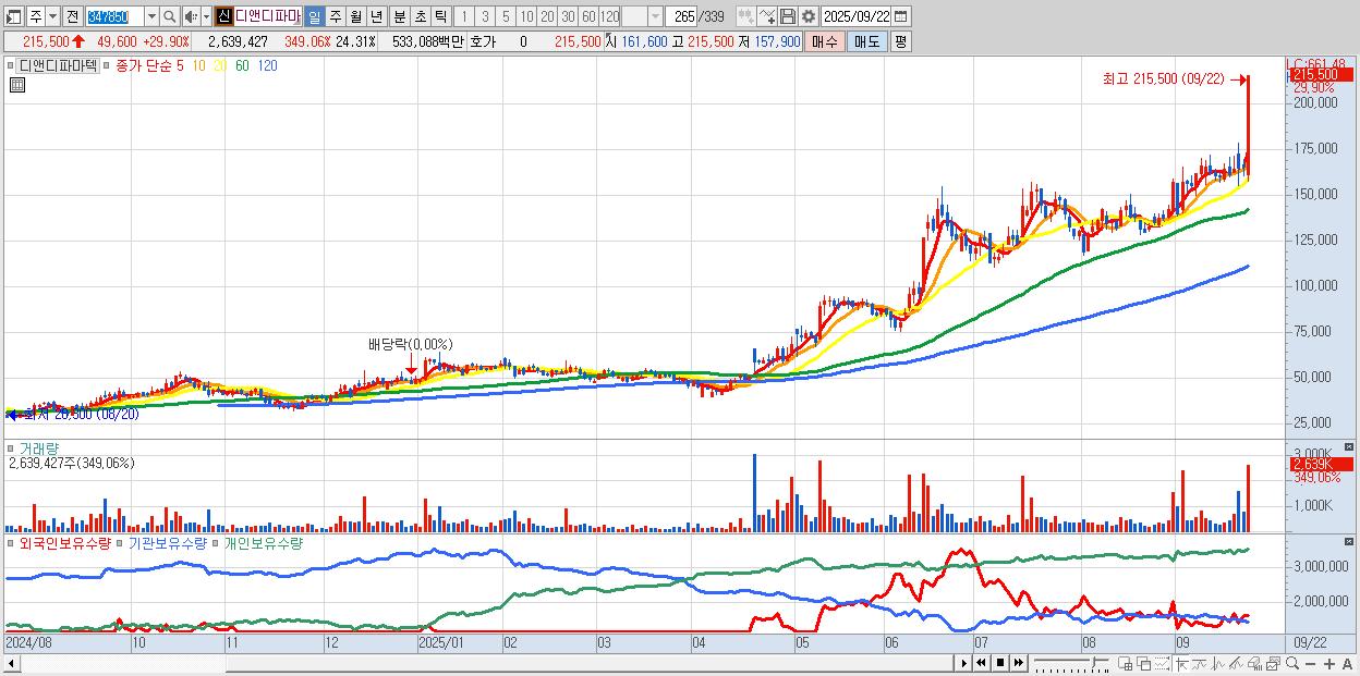 - 디앤디파마텍 (215,500원 ▲ 29.9% , 시총: 23,395억, 거래량: 2,639,427, 거래대금:5,331억)