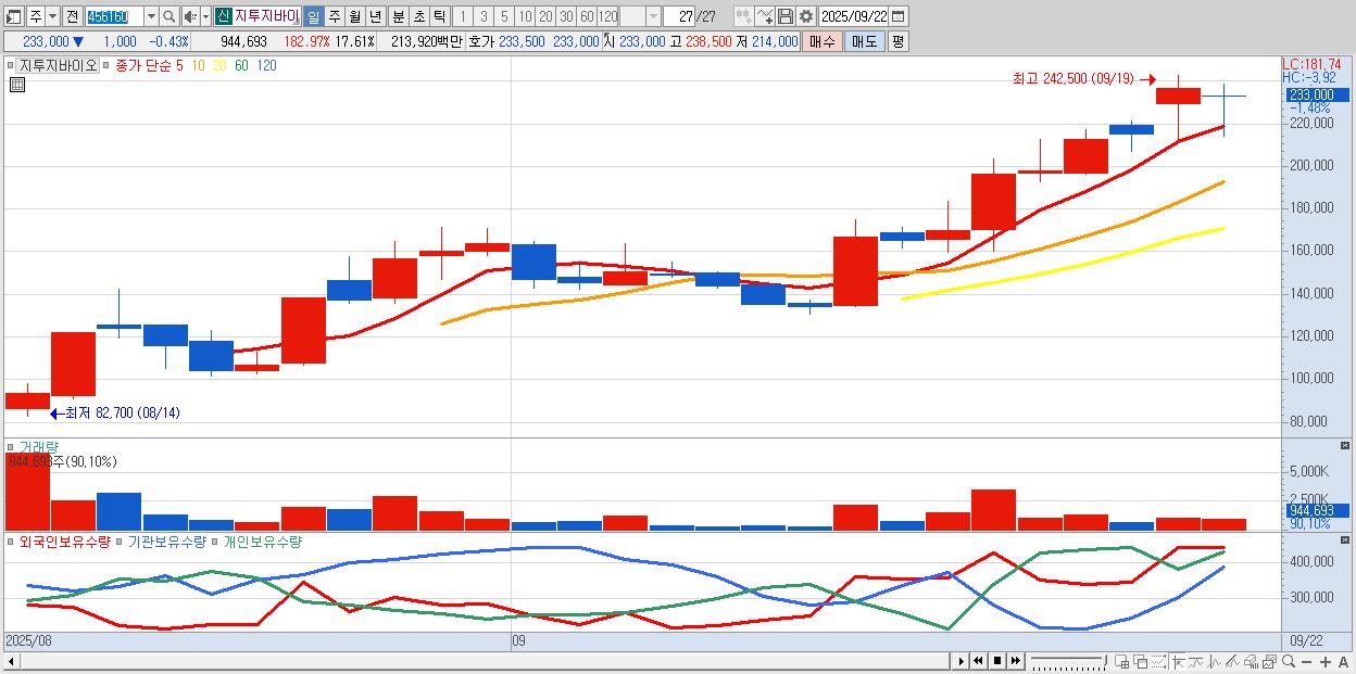 - 지투지바이오 (233,000원 ▼ -0.43% , 시총: 12,502억, 거래량: 944,693, 거래대금:2,139억)