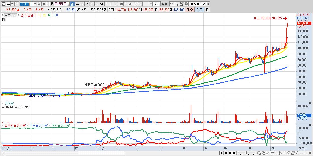 - 로보티즈 (143,600원 ▲ 5.43% , 시총: 18,985억, 거래량: 4,287,617, 거래대금:6,202억)
