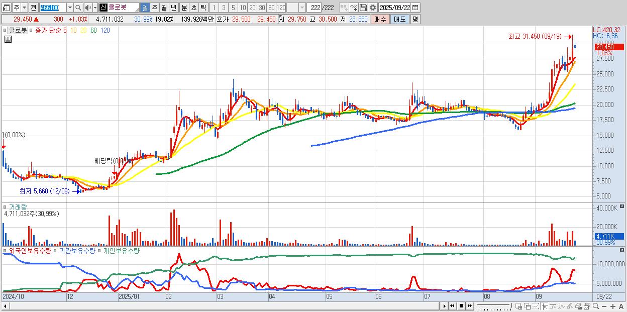 - 클로봇 (29,450원 ▲ 1.03% , 시총: 7,293억, 거래량: 4,711,032, 거래대금:1,399억)
