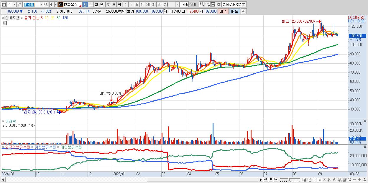 - 한화오션 (109,600원 ▼ -1.88% , 시총: 335,829억, 거래량: 1,182,021, 거래대금:1,296억)
