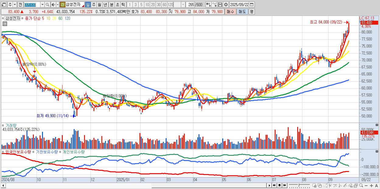 - 삼성전자 (83,500원 ▲ 4.77% , 시총: 4,942,898억, 거래량: 27,529,656, 거래대금:22,881억)