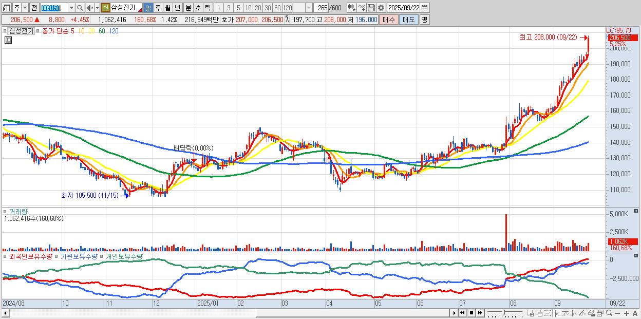 - 삼성전기 (207,000원 ▲ 4.7% , 시총: 154,616억, 거래량: 719,169, 거래대금:1,467억)