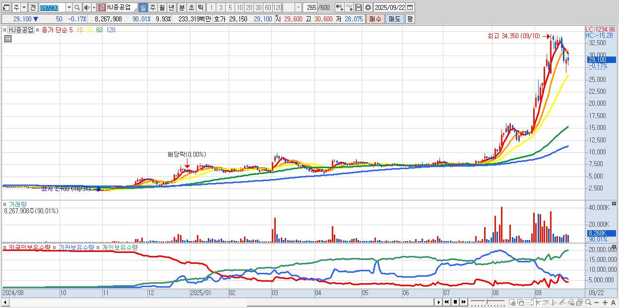 - HJ중공업 (29,100원 ▼ -0.17% , 시총: 24,233억, 거래량: 8,267,908, 거래대금:2,333억)