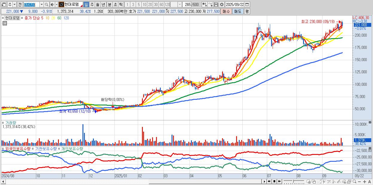 - 현대로템 (221,000원 ▼ -3.91% , 시총: 241,204억, 거래량: 931,169, 거래대금:2,052억)