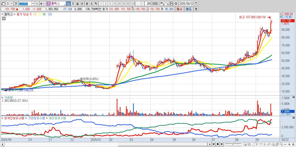 - 올릭스 (101,700원 ▲ 1.6% , 시총: 20,449억, 거래량: 1,383,856, 거래대금:1,388억)