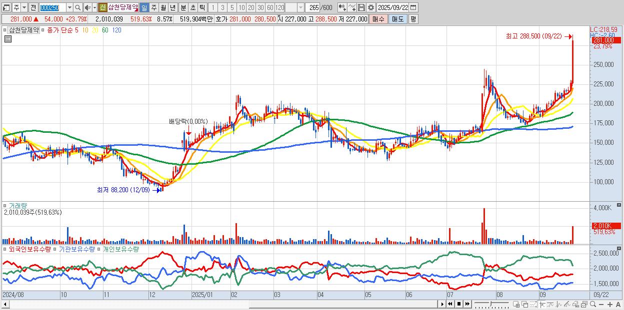 - 삼천당제약 (257,000원 ▲ 13.22% , 시총: 60,286억, 거래량: 716,627, 거래대금:1,805억)