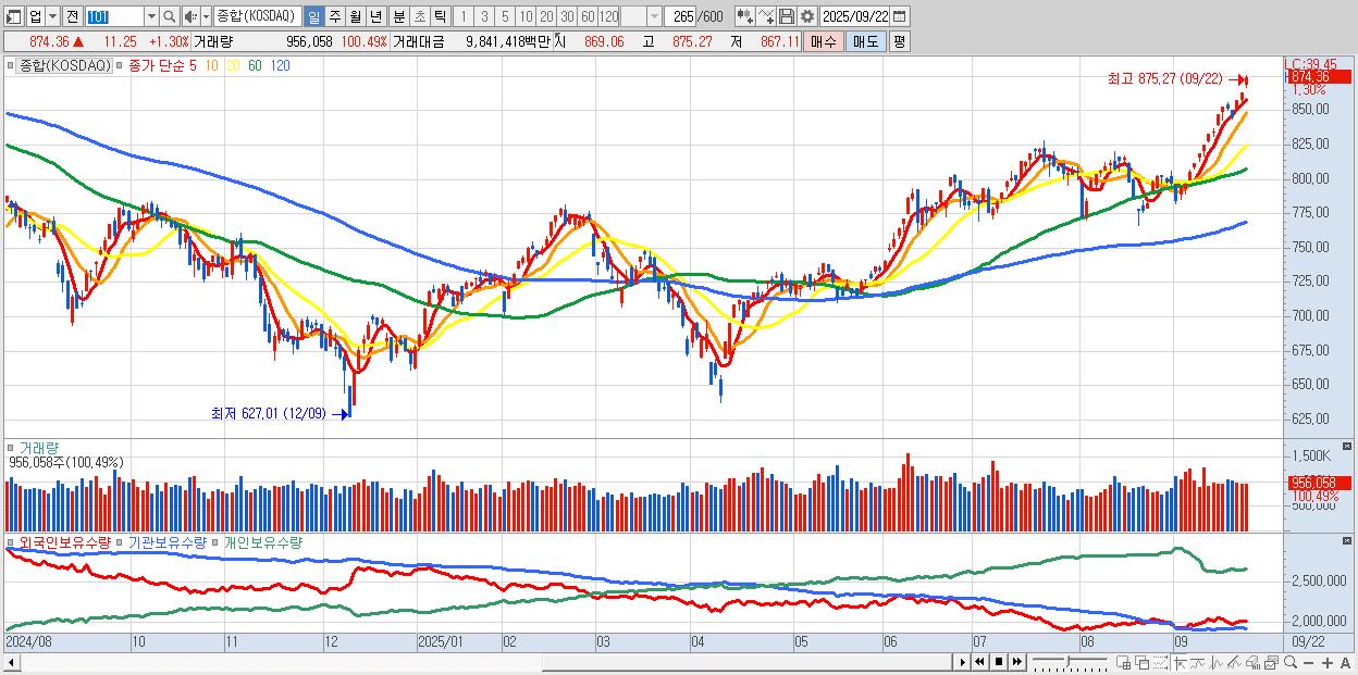 | 09/22 | 874.36 | ▲1.30% | 1,231억 | -410억 | 185억 | -1,006억 |