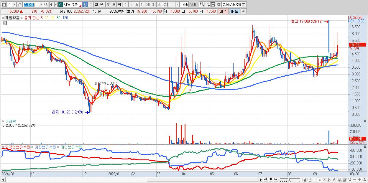 29.제일약품 15,150원 ▲ 6.02% (KOSPI, 271980)