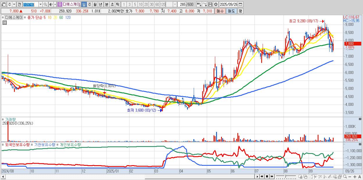 - 디에스케이 (7,800원 ▲ 7% , 시총: 2,005억, 거래량: 259,920, 거래대금:20억)