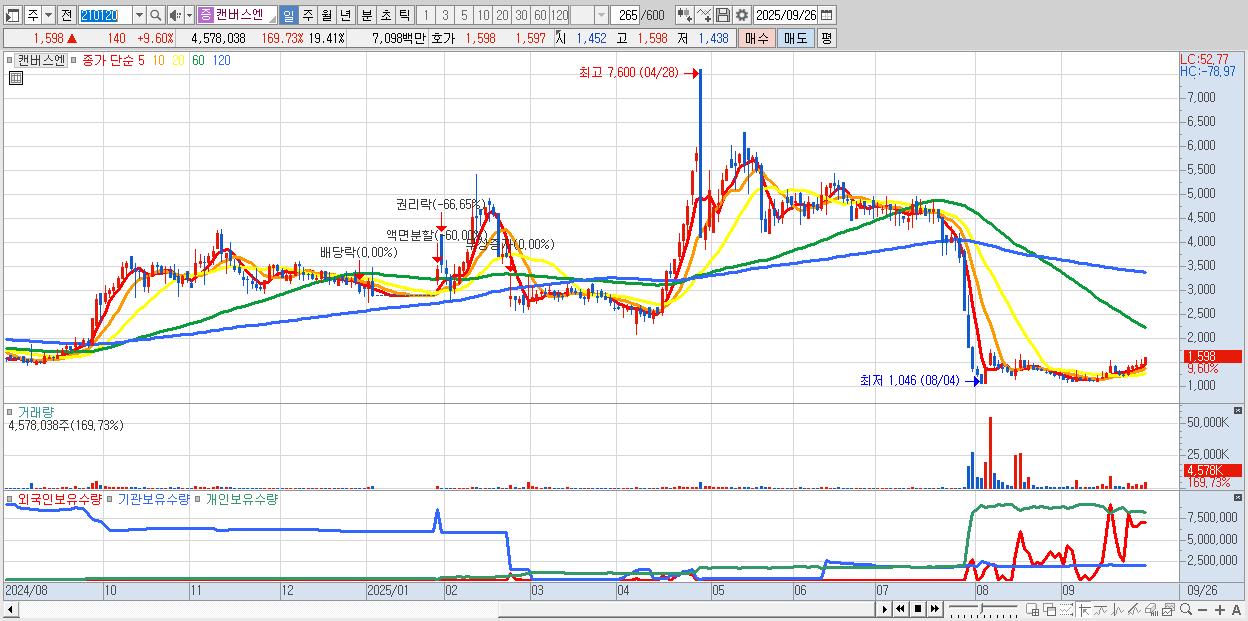 - 캔버스엔 (1,598원 ▲ 9.6% , 시총: 377억, 거래량: 4,578,038, 거래대금:71억)