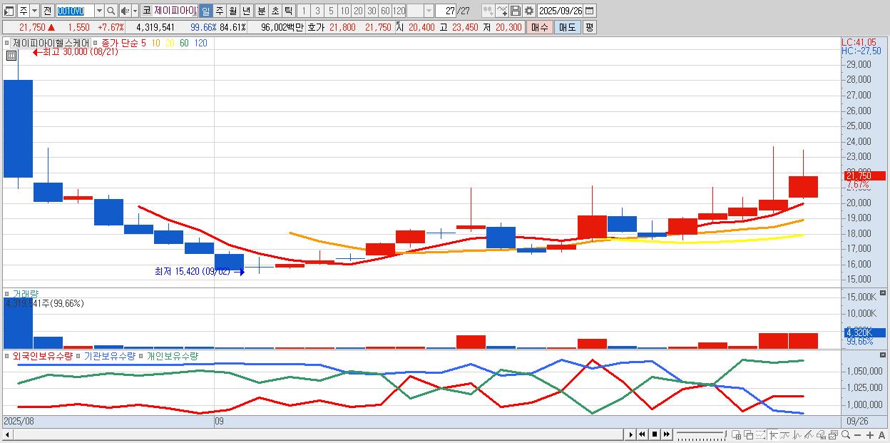 - 제이피아이헬스케어 (21,750원 ▲ 7.67% , 시총: 1,110억, 거래량: 4,319,541, 거래대금:960억)