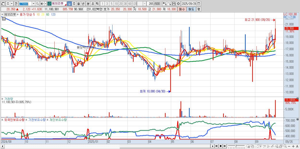 - 에브리봇 (20,400원 ▲ 11.9% , 시총: 2,508억, 거래량: 4,824,138, 거래대금:1,005억)
