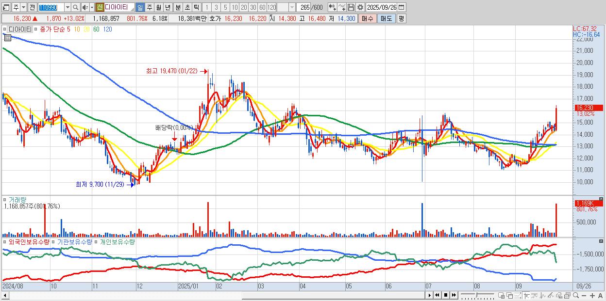 - 디아이티 (16,230원 ▲ 13.02% , 시총: 3,067억, 거래량: 1,168,857, 거래대금:184억)