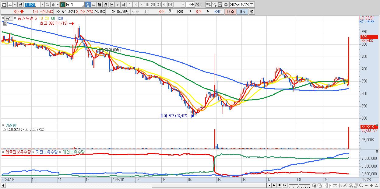 - 동양 (829원 ▲ 29.94% , 시총: 1,979억, 거래량: 62,520,920, 거래대금:468억)