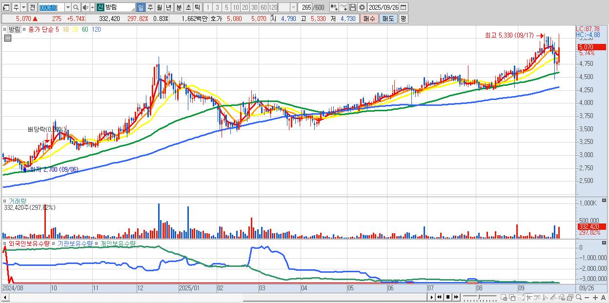 - 방림 (5,070원 ▲ 5.74% , 시총: 2,038억, 거래량: 332,420, 거래대금:17억)