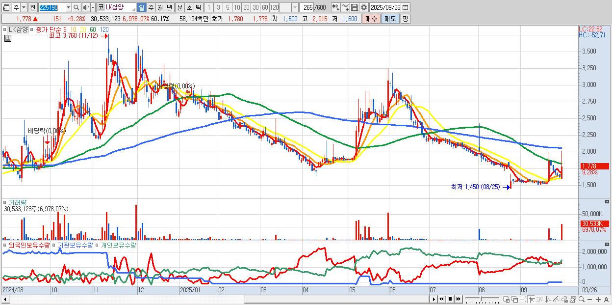 - LK삼양 (1,778원 ▲ 9.28% , 시총: 902억, 거래량: 30,533,123, 거래대금:582억)