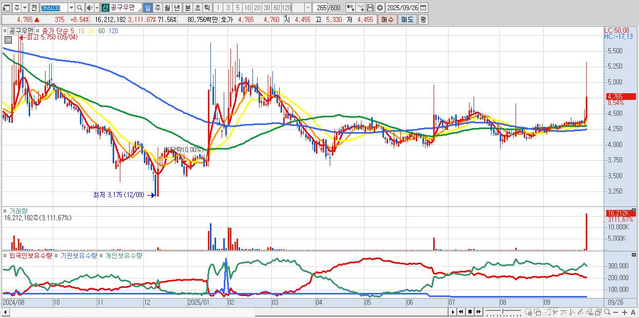 - 공구우먼 (4,765원 ▲ 8.54% , 시총: 1,079억, 거래량: 16,212,182, 거래대금:808억)