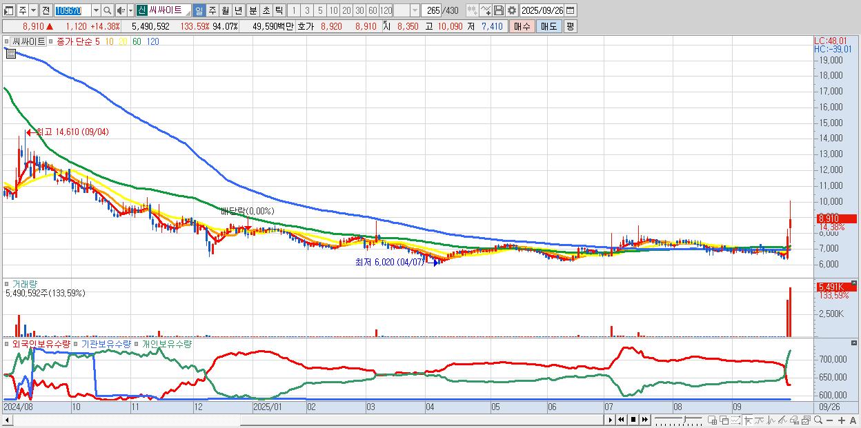 - 씨싸이트 (8,910원 ▲ 14.38% , 시총: 520억, 거래량: 5,490,592, 거래대금:496억)