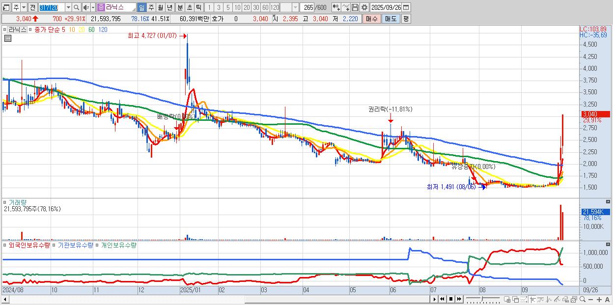 - 라닉스 (3,040원 ▲ 29.91% , 시총: 464억, 거래량: 21,593,795, 거래대금:604억)
